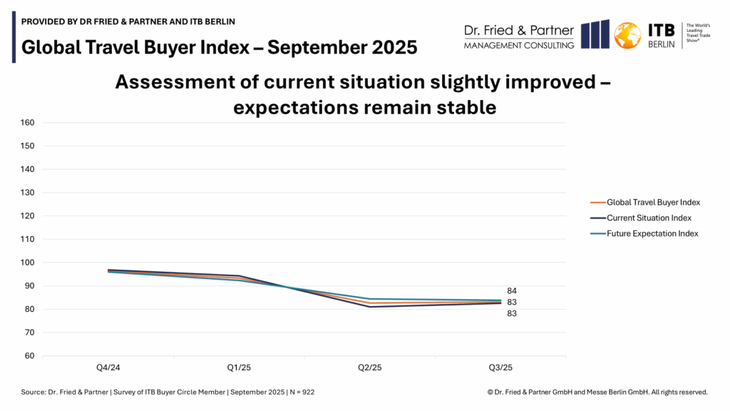 Munich & Berlin, 24 September 2025Dr. Fried & Partner and ITB Berlin publish the latest results of the Global Travel Buyer Index (GTBI) for the third quarter of 2025. The GTBI is an industry indicator for tourism purchasing and is based on a quarterly survey of international buyers from the ITB Buyers Circle. The index provides valuable insights into the current market situation and the expectations of tourism buyers and serves as an early indicator for the development of the travel market.