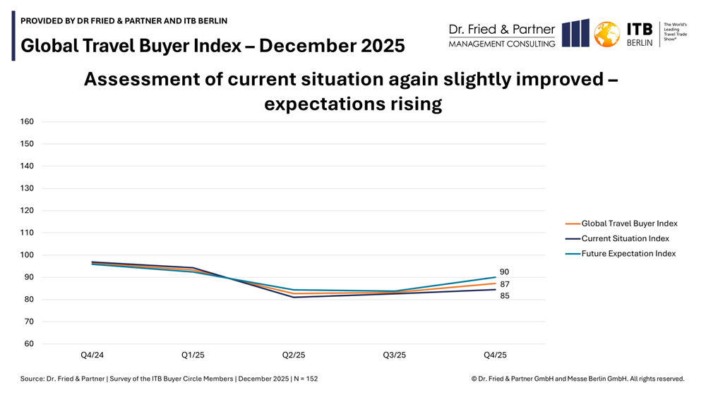 Munich & Berlin, 15 January 2026 – Dr. Fried & Partner and ITB Berlin publish the latest results of the Global Travel Buyer Index (GTBI) for the fourth quarter of 2025. The GTBI is an industry indicator for tourism purchasing and is based on a quarterly survey of international buyers from the ITB Buyers Circle. The index provides valuable insights into the current market situation and the expectations of tourism buyers and serves as an early indicator for the development of the travel market.