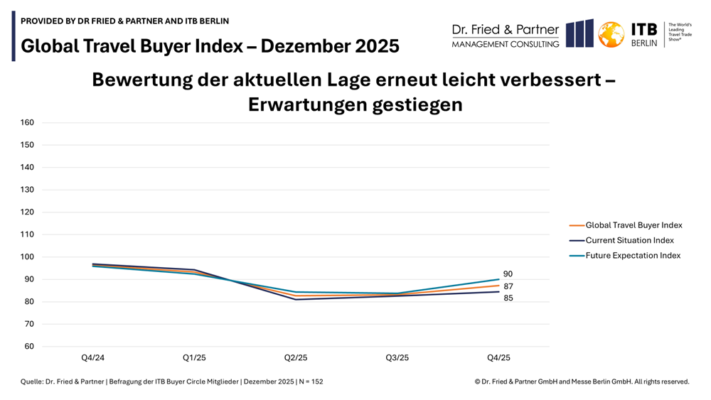 München & Berlin, 15. Januar 2026 – Dr. Fried & Partner und die ITB Berlin veröffentlichen die aktuellen Ergebnisse des Global Travel Buyer Index (GTBI) für das vierte Quartal 2025. Der GTBI ist ein Branchenindikator für den touristischen Einkauf und basiert auf einer quartalsweisen Befragung internationaler Einkäufer:innen aus dem ITB Buyers Circle. Der Index liefert fundierte Einblicke in die aktuelle Marktlage und die Erwartungen der touristischen Einkäufer:innen und dient als Frühindikator für die Entwicklung des Reisemarktes.